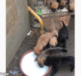 ボウルいっぱいのミルクに集まる子犬たち! あせり過ぎて…(動画)