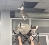 「ああっ、天井裏から猫が落ちそう…」→布地の折りたたみイスをクッションにして救う