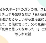 父がステージ4のガンの時、スピリチュアル気味な母が「良い民間療法があるらしいから主治医に伝えて」と俺に言って、父の死後に「死ぬと思ってなかった!」と責められた話