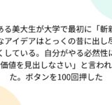 ある美大生が大学で最初に「斬新なアイデアはとっくの昔に出し尽くしている。自分がやる必然性に価値を見出しなさい」と言われた。ボタンを100回押した