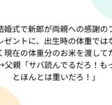 結婚式で新郎が両親への感謝のプレゼントに、出生時の体重ではなく現在の体重分のお米を渡してた→父親「サバ読んでるだろ!もっとほんとは重いだろ!」