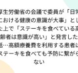 厚生労働省の会議で委員が「日常における健康の意識が大事」とした上で「ステーキを食べている高齢者は意識が高い」と発言した話…高額療養費を利用する患者はステーキを食べても予防に繋がらない