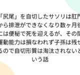 「尻尾」を自切したサソリは肛門から排泄ができなくなり数ヶ月後には便秘で死を迎えるが、その間運動能力は損なわれず子孫は残せるので自切形質は淘汰されないという話