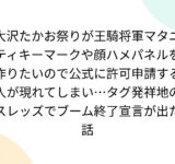 大沢たかお祭りが王騎将軍マタニティキーマークや顔ハメパネルを作りたいので公式に許可申請する人が現れてしまい…タグ発祥地のスレッズでブーム終了宣言が出た話