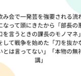 飲み会で一発芸を強要される流れになって頭にきたから「部長の悪口を言うときの課長のモノマネ」をして戦争を始めた「刀を抜かないとは言ってない」「本物の無礼講」