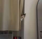 カーテンの後ろにひそむ猫が…名前を呼ぶたびにチラッと顔を出す(動画)