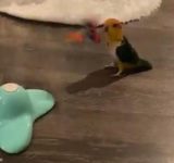 猫のクルクル回るおもちゃに翻弄されるインコ(動画)
