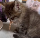 離乳したばかりの子猫が…ご馳走をくわえながらウトウトと眠る(動画)