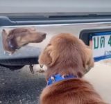 「わんわんっ!」バンパーに反射した自分に吠える犬(動画)