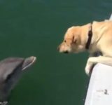 「釣りをしてたら犬がイルカに話しかけた…」→イルカも近づいて海面から顔を出す(動画)