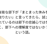 有能な部下が『まとまった休みを取りたい』と言ってきたら、試されているのは部下の忠誠心ではなく、部下への理解度ではないか?という話。