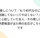 推しについて『もう40代なのに結婚してないってやばくない?』と心配していた友人…その推しに熱愛報道が出た時の反応がこちらです