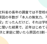 文科省の長年の調査では不登校の原因の半数が「本人の無気力、不安」だったんだけど、それは学校に聞いた結果で、近年はじめて子供と家庭に聞いたら原因の3割が「先生」、3割が「いじめ」だったという話やってて、いや最初から子供に聞けよという感想しかない