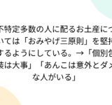 不特定多数の人に配るお土産については「おみやげ三原則」を堅持するようにしている。→「個別包装は大事」「あんこは意外とダメな人がいる」