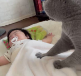 赤ちゃんのお腹でマッサージ屋さんをするも反応してもらえず去っていく猫さんがこちら「何という尊さ」