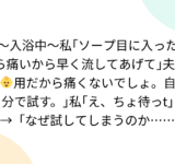 〜入浴中〜私「ソープ目に入ったら痛いから早く流してあげて」夫「👶用だから痛くないでしょ。自分で試す。」私「え、ちょ待っt」→「なぜ試してしまうのか…」「好奇心は猫をも殺す」