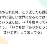 褒められた時、こう返したら謙遜せずに優しい世界になるのでは?という返し技。→「今度やってみよう」「いつもは『ありがとうございます』って言ってる」