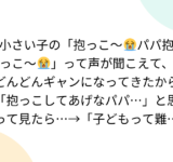 小さい子の「抱っこ~😭パパ抱っこ~😭」って声が聞こえて、どんどんギャンになってきたから「抱っこしてあげなパパ…」と思って見たら…→「子どもって難しいな」