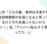 上司『うちの妻、食材は冷凍すれば賞味期限が永遠になると思ってるけどそれ永遠じゃないからァ!』私『アハハ~(私もそう思ってた…)』