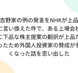 吉野家の例の発言をNHKが上品に言い換えた件で、ある上場会社に下品な株主提案の翻訳が上品だったため外国人投資家の賛成が多くなった話を思い出した