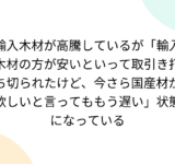 輸入木材が高騰しているが「輸入木材の方が安いといって取引き打ち切られたけど、今さら国産材が欲しいと言ってももう遅い」状態になっている