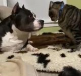 猫が大きな犬にネコパンチしたら…小さな犬が「なんてことをするんだ!」と叱る(動画)