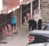 スマホに夢中の女性の背後にクマが忍び寄る!→気付いても逃げずに撮影を始める(動画)