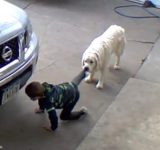 親友の男の子と離れたくない犬が…足にしがみつく(動画)