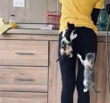 2匹の子猫がキッチンに立つ女性によじ登る「家事は進まないけど…」(動画)
