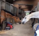 通路越しの2頭の馬が…首を伸ばして鼻と鼻でキス(動画)