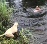 池に跳び込んだ飼い主を見た犬「おぼれてる!」→救出しにダイブする(動画)