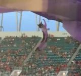 アメフトの試合中、猫が上階デッキから落ちて宙づりになるアクシデント発生→観客らの機転でまさかの結末に