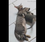 愛情いっぱいのママ…子猫を背後からギューッと抱っこ(動画)