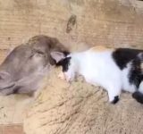 猫だってモフモフは気持ちいい…羊の背中ですりすり&マッサージ(動画)