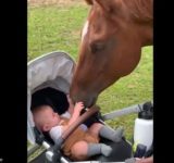 赤ちゃん「大きい…」馬「小さい…」初めての出会い(動画)