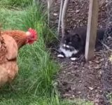 ニワトリを脅していたつもりの猫、だんだん弱気になる(動画)