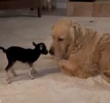 ヨチヨチ歩きの赤ちゃんヤギと世話役を任された心優しい犬(動画)