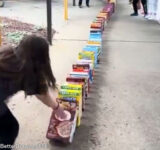 小学生たちがシリアルの箱を使ったドミノ倒しに挑戦…興奮が止まらない