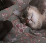 ベッドの上で犬と向かい合う猫が…とんでもない何かに気付いてしまった