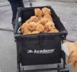 元気いっぱいのゴールデンレトリバーの子犬12匹を健康診断に連れて行く(動画)