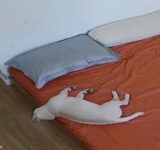 ベッドで眠りこけて頭から落ちる犬…でも着地が美しい(動画)
