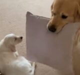 小さな弟と初対面の犬…なぜか興奮しすぎてクッションをくわえる(動画)