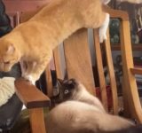 気ままな猫が心配性の猫の「上」を通ろうとして…残念な結果に終わる(動画)