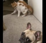 犬との距離の縮め方がわからない子猫…おかしなステップを踏み続ける(動画)