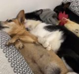 ベッドで仲良く添い寝する犬と猫と…ニワトリも!?(動画)