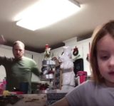 小さな娘のオンライン授業の後ろで踊り続けるパパ…娘は冷めきった態度