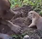 穴掘りするモグラが犬におしりをペチペチされて…カンカンに怒る