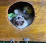 巣箱に入り込んだ子猫とインコがめちゃくちゃ仲良しなとき(動画)