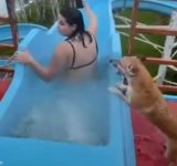 お姉さんと一緒にウォータースライダーを駆け下りる犬(動画)