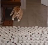 紙コップで通せんぼされた猫…だんだんテンションが上がっていく(動画)